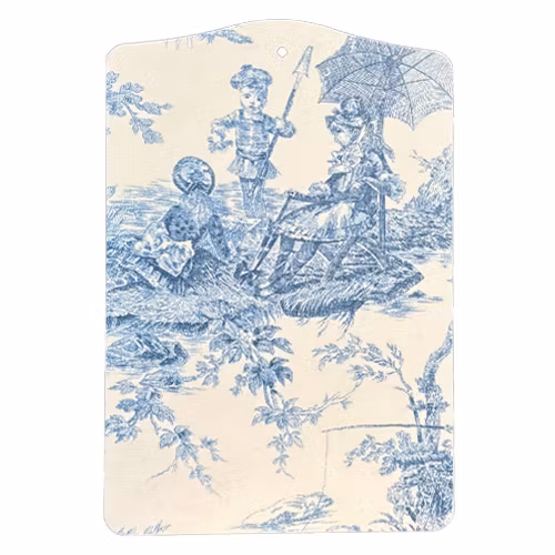 Våra egna skärbrädor med Toile de jouy mönster försedda med tyg.