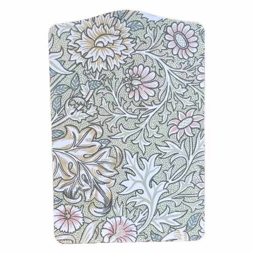 Tyget ger ytan en tydlig textil struktur och varje produkt blir unik eftersom mönstrets placering varierar. Skärbrädorna är tillverkade i exteriör MDF och har en melaminbaserad yta som är tålig mot värme och alkoholEtt genuint svenskt hantverk. Med William Morris tyg